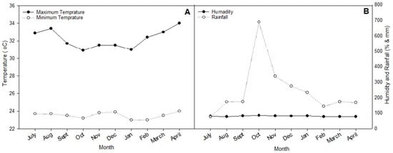 The mean average range of (A) temperature and (B) relative humidity and total rainfall during both seasons.