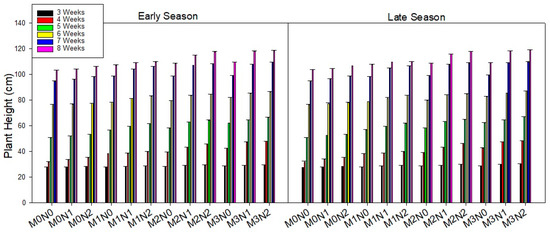 Impact of different levels of arbuscular mycorrhizal fungi and nitrogen fertilizer on plant height (cm). Note: The standard error of the mean is represented by vertical bars.