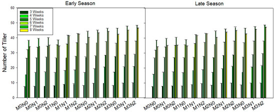 Impact of different levels of arbuscular mycorrhizal fungi and nitrogen fertilizer on tiller number. Note: The standard error of the mean is represented by vertical bars.