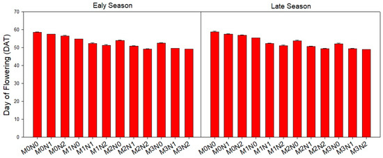 Impact of different levels of arbuscular mycorrhizal fungi and nitrogen fertilizer on flowering time days after transplanting (DAT). Note: The standard error of the mean is represented by vertical bars.