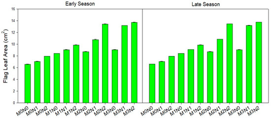 Impact of different levels of arbuscular mycorrhizal fungi and nitrogen fertilizer on flag leaf area (cm2). Note: The standard error of the mean is represented by vertical bars.