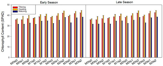 The effect of the combination of AMF and N fertilizer on FLA is presented in Figure 5. FLA was significantly affected by AMF and N fertilizer. M3N2 increased FLA by 107.76% and 108.02% compared to control during both seasons, respectively, followed by M2N2 103.67% and 103.68%, and M3N1 99.61% and 99.94%. The smallest FLA value occurred in M0N0, with 6.60 and 6.61 cm2 during both seasons, respectively, followed by M0N1 and M0N2. The interaction between AMF and N was significant (p < 0.05) for chlorophyll content (SPAD) during all three growth stages (tillering, heading, and maturity) in both seasons (Figure 6). The results showed that the M3N2 treatment resulted in an average increased SPAD by 20.71% and 20.62% during both seasons. N fertilizer improved the chlorophyll content (SPAD) value. N fertilizer at a rate of 180 kg N ha−1 resulted in a higher SPAD value than a rate of 90 kg N ha−1.