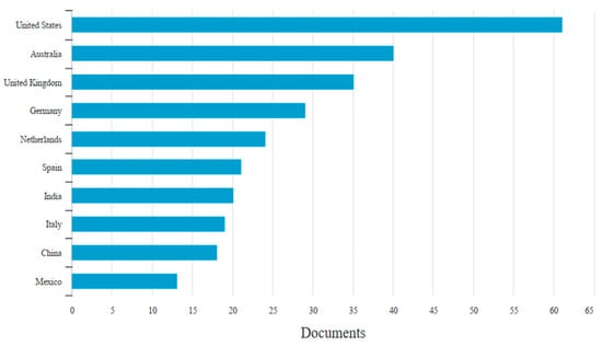 Figure 2), it can be observed that the United States has the highest number of papers, with 61 articles (16.9%). The other countries on the top 10 list have also made significant contributions, albeit less than the United States. These countries are Australia (40 papers, 6.6%), United Kingdom (35 papers, 9.7%), Germany (29 papers, 8.1%), Netherlands (24 papers, 6.7%), Spain (21 papers, 5.8%), India (20 papers, 5.6%), Italy (19 papers, 5.3%), China (18 papers, 5.0%), and Mexico (13 papers, 3.6%). However, only one article published by scientists affiliated with Ukraine has been indexed in Scopus.