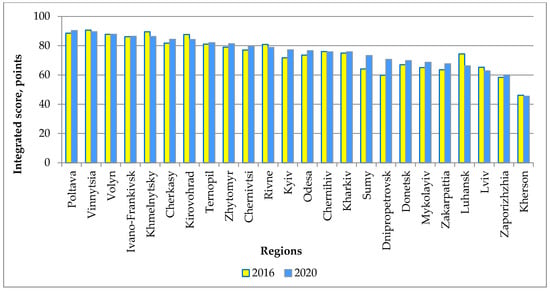 During the study period, different regions of Ukraine took the first place in the ranking for the integrated indicator of the degree of water resource efficiency. The Vinnytsia region was in first place in 2016, while the Volyn and Poltava regions each held the position twice in 2017–2019 and 2018–2020. However, the Kherson region consistently had the lowest ranking throughout the period. It is worth noting that the absolute best value for the integrated indicator decreased from 0.094 in 2016 to 0.107 in 2019, but showed significant improvement to 0.097 in 2020. Conversely, the absolute worst value showed a negative trend, decreasing from 0.537 in 2017 to 0.546 in 2019–2020.