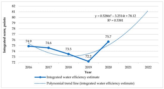 According to the model used, the integrated score is predicted to increase to approximately 81.2 in 2022. However, it’s important to note that 2020 was an exceptional year for the study period, with a significant increase in this indicator. Additionally, the estimated value of gross regional product (GRP) was used to calculate the integrated indicators of the degree of water resource savings. Therefore, the current forecasts for an improvement in this indicator in 2021 and beyond lack sufficient evidence to support them.