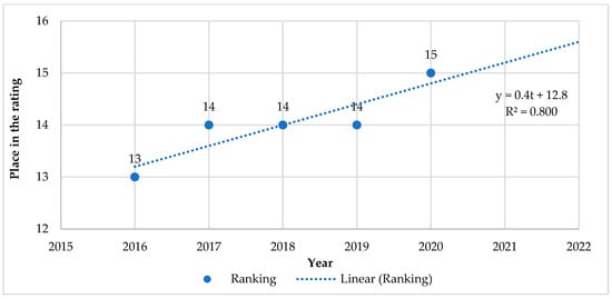 Figure 11. To model the trend line of this indicator until 2022, we used a second-order polynomial approximation as it provides the best level of reliability compared to other functions (0.5381, or 53.81%). Although the third-order polynomial has a better level of reliability (0.9626, or 96.26%), its approximation is an overly optimistic scenario, which, taking into account current realities, is unlikely.