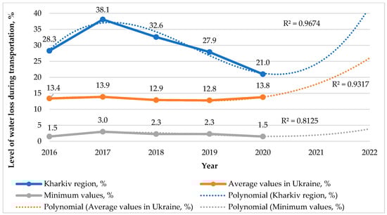 43], the Kharkiv region had higher average values compared to the national average for key indicators such as water loss during transportation and water capacity in the utility sector over the study period. These indicators had the most significant impact on the integrated degree of water resource efficiency in the region, which, in turn, influenced the region’s overall ranking.