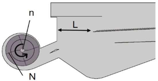 The key structure and working parameters of the cleaning fan mainly include the horizontal distance from the air outlet to the upper screen (air supply distance), the fan speed, and the number of blades [14,15]. The above three key parameters are selected as test factors, and the screen surface wind speed is taken as a test index to carry out a simulation single-factor test and multi-factor test. Based on the structural parameters of the existing agricultural centrifugal fans in China and the operation experience of the harvester cleaning device [16,17], the value range of the single factor test is selected as follows: fan speed n = 800–1100 r/min, blade number N = 4–10, air supply distance L = 340–700 mm. In the single factor test, the values of fixed factors are, respectively, supply air distance 580 mm, fan speed 1000 r/min, and number of blades 4. In the case of no outfall in the cleaning room, the influence law of different working parameters of the fan on the air field in the cleaning room is explored, and the structural diagram of the test factors is shown in Figure 2.
