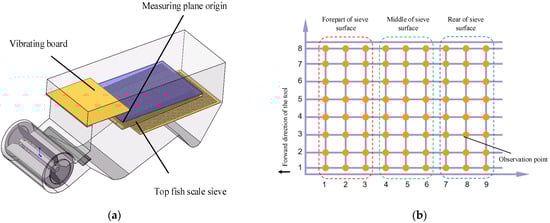 In order to facilitate the observation of the airflow velocity distribution in the cleaning chamber, considering that the screen surface is always in a reciprocating motion during the operation process, combined with the space requirement of placing detection sensors, a measurement plane was established 120 mm above the screen surface of the fish scale screen in the cleaning chamber with the right apex of the front end of the fish scale screen as the origin. Since the cleaning operation is mainly carried out on the upper cleaning screen, the upper screen surface bears a large amount of material load, so this paper mainly studies the airflow of the upper cleaning screen surface and the airflow of the lower cleaning screen surface is not studied. The position of the observation plane is shown in Figure 3a. In order to facilitate the description of the flow field of the screen surface, the measuring plane was divided into three areas: the front part of the screen (zone A), the middle part of the screen surface (zone B), and the back part of the screen surface (zone C). Nine velocity measurement points were uniformly set in the measuring plane, and eight velocity measurement points were uniformly set in the longitudinal plane, totaling 72 velocity measurement points. The distribution of velocity measurement points is shown in Figure 3b.