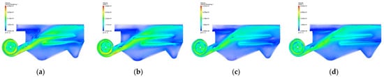 In order to explore the influence of the number of fan blades on the airflow field of the cleaning chamber, the airflow field of the cleaning chamber with the number of fan blades 4, 6, 8, and 10 was simulated, and the results are shown in Figure 9. As shown in Figure 9a–d, as the number of blades increases, the contact area between the blades and the gas increases, the work done by the airflow increases, and the uniformity of the airflow velocity on the upper screen surface is improved as a whole.