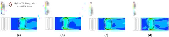 Airflow field distribution of specific detection plane in cleaning room. (a) 4 blades. (b) 6 blades. (c) 8 blades. (d) 10 blades.