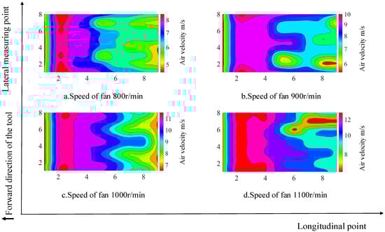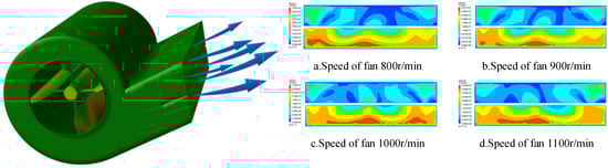 On the whole, when the fan speed is 900 r/min, the speed of the air outlet on the fan is 2.8–16.1 m/s, and the degree of uniformity between the wind speed and the air speed on the left side is slightly higher than that on the right side. The velocity of the lower outlet is 8.5–28.7 m/s, that is, the airflow of the lower outlet has a great influence on the flow field distribution in the cleaning room. When the fan speed is less than 900 r/min, the wind speed of the upper and lower outlet does not change significantly. When the fan speed increases to 1000 r/min, the wind speed of the upper and lower outlet changes significantly in the width and height direction, and the low-speed area is supplemented by airflow. The wind speed of the upper outlet ranges from 3.1 to 18.7 m/s, and the wind speed of the lower outlet ranges from 10.4 to 31.2 m/s. As the fan speed increases, the wind speed of the outlet tends to be stable. Moreover, the uniformity of wind speed in the outlet has also been greatly improved.