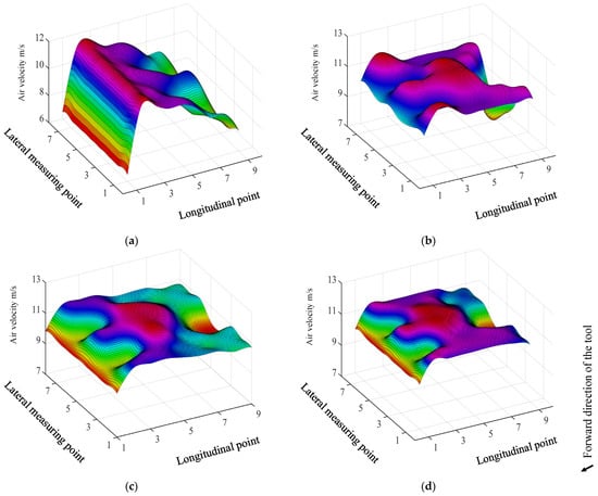 Airflow velocity cloud image of the observation plane 120 mm above the fish scale screen inside the cleaning device. (a) Distance of air supply 340 mm. (b) Distance of air supply 460 mm. (c) Distance of air supply 580 mm. (d) Distance of air supply 700 mm.