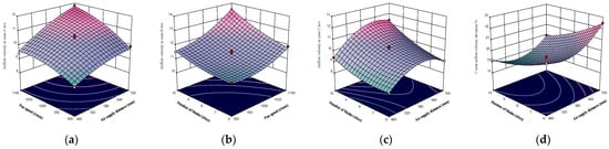 Response surface analysis. (a) Airflow velocity in zone A. (b) Airflow velocity in zone B. (c) Airflow velocity in zone C. (d) Airflow velocity deviation degree in zone D.