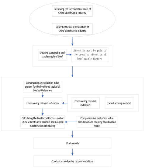 In order to achieve the research objectives and content of this article, based on reviewing the development and current situation of China’s beef cattle industry, this study first constructs a comprehensive evaluation index system for the livelihood capital of Chinese beef cattle farmers. On this basis, expert scoring and entropy methods are combined to empower the indicators, and the comprehensive evaluation value of the livelihood capital of Chinese beef cattle farmers is calculated. This study systematically analyzes the livelihood capital status of beef cattle farmers in different regions and farming modes and clarifies the current level of livelihood capital of beef cattle farmers in China. Finally, by calculating the coupling and co-scheduling level of Chinese beef cattle farmers, we analyze whether the current livelihood capital structure of Chinese beef cattle farmers is coordinated, and form research conclusions and policy recommendations based on this.
