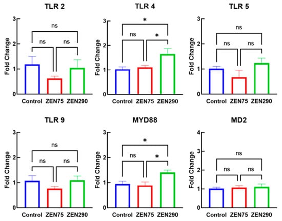 Effect of ZEN on gene expression of toll-like receptors TLR2, TLR 4, TLR5, and TLR9, and MYD88 and MD2 receptors in the colon of weaned piglets exposed to a concentration lower (75 ppb) or above (290 ppb) EC recommendation in feed. The statistical significance was marked graphically as follows: ns—not significant (p-value ≥ 0.05), *—significant (0.05 ≥ p-value > 0.01).
