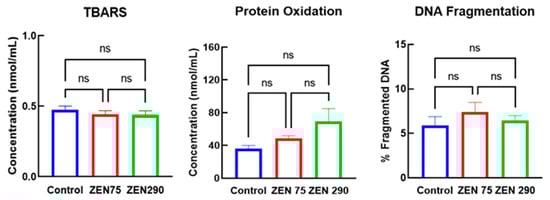 Regarding oxidative stress, at all three analyzed levels of lipid (TBARS), protein (protein carbonyl), and nucleic acids (DNA fragmentation), neither of the two concentrations of ZEN induced significant changes. However, in the case of protein oxidation, an increasing trend (p = 0.069) is observed for ZEN 290 (Figure 2).