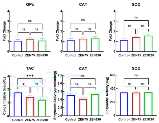 Effect of ZEN on total antioxidant capacity (TAC) and antioxidant enzymes CAT, SOD, and GPx in the colon of weaned piglets exposed to a concentration lower (75 ppb) or above (290 ppb) EC recommendation in feed. The statistical significance was marked graphically as follows: ns—not significant (p-value ≥ 0.05), *—significant (0.05 ≥ p-value > 0.01) and ***—extremely significant (0.001 ≥ p-value > 0.0001).