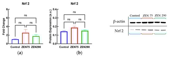 Analyzing the gene (Figure 4a) and protein expression (Figure 4b) of the Nrf2 signaling molecule responsible for the activation of antioxidant enzymes response, we did not observe a significant effect caused by any of the analyzed concentrations; however, in the case of ZEN 75, an increasing trend was observed in Nrf2 protein expression (p = 0.086).