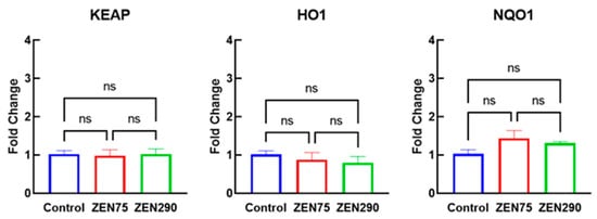 Effect of ZEN on gene expression of oxidative stress markers KEAP1, HO1, and NQO1 in the colon of weaned piglets exposed to a concentration lower (75 ppb) or above (290 ppb) EC recommendation in feed. The statistical significance was marked graphically as follows: ns—not significant (p-value ≥ 0.05).