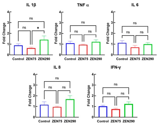 Effect of ZEN on gene expression of pro-inflammatory cytokines IL-1β, TNF α, IL 6, IL 8, and IFN-γ in the colon of weaned piglets exposed to a concentration lower (75 ppb) or above (290 ppb) EC recommendation in feed. The statistical significance was marked graphically as follows: ns—not significant (p-value ≥ 0.05), *—significant (0.05 ≥ p-value > 0.01).