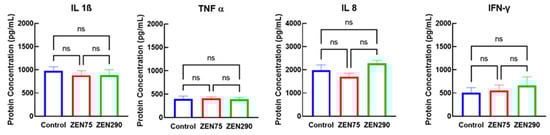 Effect of ZEN on the protein concentration of pro-inflammatory cytokines IL-1β, TNF α, IL 8, and IFN-γ in the colon of weaned piglets exposed to a concentration lower (75 ppb) or above (290 ppb) EC recommendation in feed. The statistical significance was marked graphically as follows: ns—not significant (p-value ≥ 0.05).