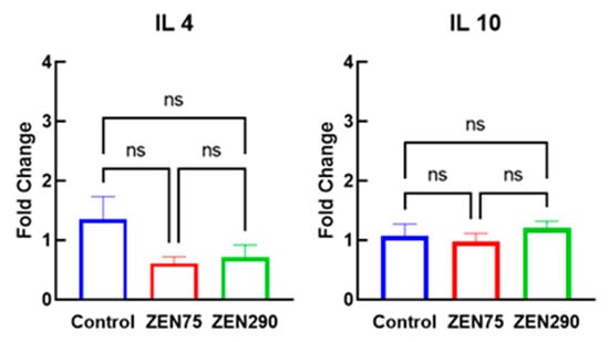 Effect of ZEN on gene expression of anti-inflammatory cytokines IL 4 and IL 10 in the colon of weaned piglets. The statistical significance was marked graphically as follows: ns—not significant (p-value ≥ 0.05).