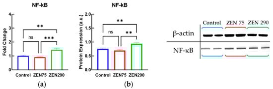 The gene and protein expression of the NF-kB nuclear receptor, a key marker of the signaling pathway involved in inflammation and oxidative stress, did not undergo significant changes in 75 ppb ZEN group compared to the control, while in the case of 290 ppb ZEN group, a significant increase was observed for both genes (43% increase, p = 0.028, Figure 9a) and protein expression (24% increase, p = 0.0013, Figure 9b) of NF-kB when compared to control.