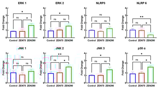 Effect of ZEN on gene expression of MAPKs ERK 1, ERK 2, JNK 1, JNK 2, JNK 3, and p38α, and inflammasomes NLRP 3 and NLRP 6 in the colon of weaned piglets. The statistical significance was marked graphically as follows: ns—not significant (p-value ≥ 0.05), *—significant (0.05 ≥ p-value > 0.01), **—very significant (0.01 ≥ p-value > 0.001).