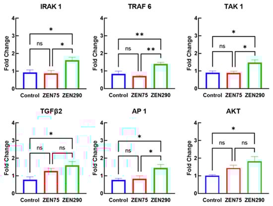 Similar results were obtained in the case of the gene expression of other signaling molecules (Figure 11). As in the case of MAPKs, ZEN 75 did not induce significant changes, while ZEN 290 induced a significant increase compared with control in the gene expression level of IRAK1 (76%), TRAF 6 (67%), TAK 1 (64%), TGFβ2 (103%), AP1 (88%), and AKT (81%).