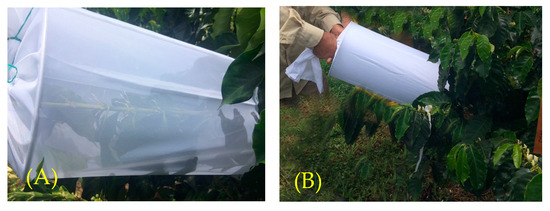 For each evaluation, 400 coffee trees were randomly selected from each plot and randomly assigned to the following treatments (T): T1: designed to determine the effect of pollination without the participation of insects, wind, gravity, and self-pollination, where coffee branches were enclosed in sleeves of mesh fabric that allowed for the entrance of pollen but not insects; T2: designed to determine the effect of wind and gravity on coffee flowers pollination, with coffee branches emasculated and enclosed in sleeves of mesh fabric; T3: evaluated the effect of self-pollination (unemasculated flowers) and consisted of coffee branches enclosed in sleeves made with 300-thread-count fabric that did not allow for the entrance of pollen or insects; T4: evaluated the natural pollination with participation of insects and consisted of coffee branches fully exposed (not enclosed); T5: evaluated the effect of wind, gravity, and insect pollination on coffee flowers, had coffee branches emasculated and exposed (not enclosed); T6: a control for emasculation, consisted of coffee branches emasculated and enclosed in 300-thread-count fabric that did not allow for the entrance of pollen and insects; T7: determined the effect of cross-pollination, branches were emasculated, hand pollinated with pollen from other plants, and enclosed in sleeves of 300-thread-count fabric that did not allow for the entrance of pollen and insects; T8: evaluated the effect of self-pollination, branches were emasculated, hand pollinated using pollen from the same plant, and enclosed in sleeves made of 300-thread-count fabric that did not allow for the entrance of pollen and insects (Table 2 and Table A2).