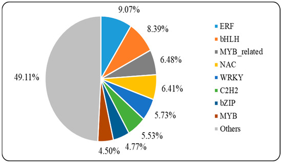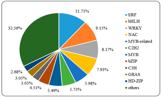 All TF genes were subjected to trend analysis, and 820 genes with significant differences in expression were identified. Differential gene expression analysis showed that these genes were distributed in eight expression modules (Figure 4). The genes with significantly different expression levels after different salt treatments (p < 0.05) were all distributed in the four modules of Profile 0, 1, 6, and 7, with 83, 239, 222, and 64 genes, respectively. These DEGs were mainly distributed in the ERF (96, 11.71%), bHLH (75, 9.15%), WRKY (67, 8.17%), NAC (65, 7.93%), MYB-related (49, 5.98%), C2H2 (47, 5.73%), MYB (45, 5.49%), bZIP (37, 4.51%), C3H (25, 3.05%), GRAS (25, 3.05%), and HD-ZIP (22, 2.68%) families (Figure 5). Comparing the numbers of DEGs in all TF families showed that most DEGs were concentrated in the top ten TF families mentioned above (Figure 6).