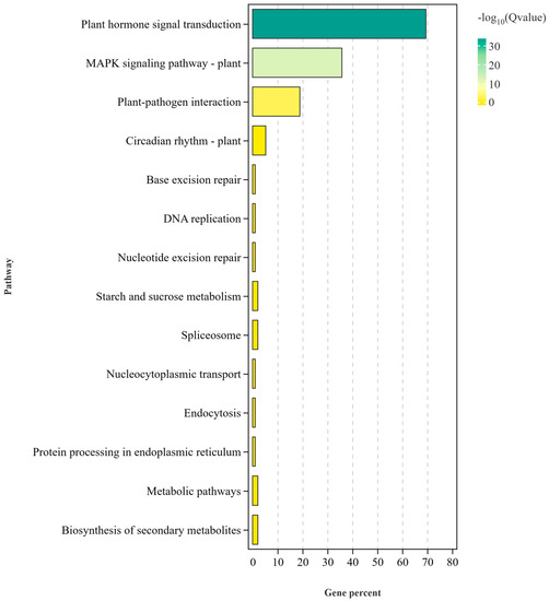 In order to better understand the main biochemical and signal transduction pathways related to the obtained TFs, KEGG pathway analysis was conducted on the TF family (Figure 2). A total of 95 TF genes were significantly enriched in 14 pathways, including plant hormone signal transduction (66 unigenes), the MAPK (Mitogen-activated protein kinases) signaling pathway (34 unigene), plant–pathogen interaction (18 unigene), circadian rhythm (5 unigene), base exception repair (1 unigene), and DNA replication (1 unigene). These annotations provide important information for studying the specific functions, processes, and mechanisms involved in the salt tolerance of halophytes.