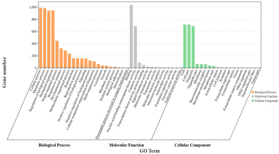GO enrichment analysis of the transcription factor genes. Note: under salt stress, a total of 54 functions were anno-tated, and 1191 genes were enriched in GO annotation and enrichment analysis. Among the three ontological processes, binding (GO:0005488) and nuclear acid binding transcription factor activity (GO:0001071) had the highest distribution of Molecular Func-tion; (GO:0005623), cell part (GO:0044464), and organelle (GO:0043226) had the highest distribution of Cell Component; cellular process (GO:0009987), metabolic process (GO:008152), regulation of biological process (GO:0050789), and biological regulation (GO:0065007) had the highest distribution of Biological Process.