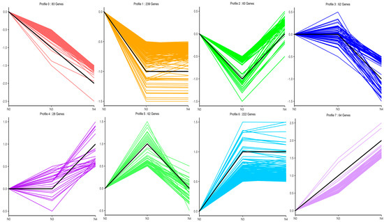 Gene expression module diagram for trend analysis of all transcription factors. Note: After trend analysis, there were a total of 820 differentially expressed genes distributed in 8 expression modules. They were profile 0 (83 genes), profile 1 (239 genes), profile 2 (60 genes), profile 3 (62 genes), profile 4 (28 genes), profile 5 (62 genes), profile 6 (222 genes), and profile 7 (64 genes). In addition, the gene expression in the four modules of profile 0, 1, 6, and 7 showed significant differences after different concentrations of salt stress (p < 0.05). N0: 0 mM/L NaCl stress; N3: 600 mM/L NaCl stress; N4: 800 mM/L NaCl stress.