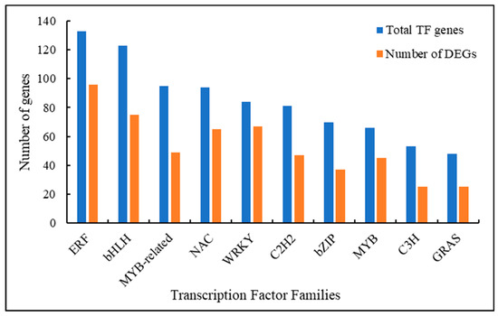 Numbers of genes in the top 10 transcription factor families. Note: Statistics on the total number of TF in the top 10 TF families of Glaux maritima and the number of differentially expressed genes in trend analysis. The 10 TF families were ERF (TF: 133 genes, DEGs: 96 genes), bHLH (TF: 123 genes, DEGs: 75 genes), MYB-related (TF: 95 genes, DEGs: 49 genes), NAC (TF: 94 genes, DEGs: 65 genes), WRKY (TF: 84 genes, DEGs: 67 genes), C2H2 (TF: 81 genes, DEGs: 47 genes), bZIP (TF: 70 genes, DEGs: 37 genes), MYB (TF: 66 genes, DEGs: 45 genes), C3H (TF: 53 genes, DEGs: 25 genes) and GRAS (TF:48 genes, DEGs: 25 genes). TF: transcription factor, DEGs: differentially expressed genes.