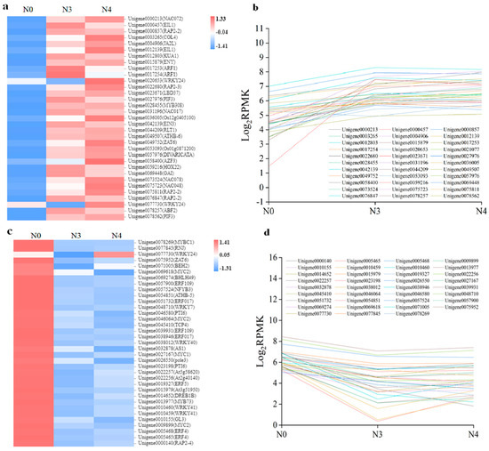 The differentially expressed TF genes were identified. Under N3 and N4 salt concentration stress, 33 up-regulated and 35 down-regulated DEGs were identified (Figure 7a,c). Differentially expressed TFs included ERF, WRKY, EIN, MYC, MYB, ABF, ARF, and NAC family members. To further understand the expression trends of these single genes, a trend change diagram (Figure 7b,d) was constructed from the log2 FPKM values of these 68 genes. This comprehensive analysis showed that under N3 and N4 conditions, the expression of all single genes increased or decreased in a consistent trend.