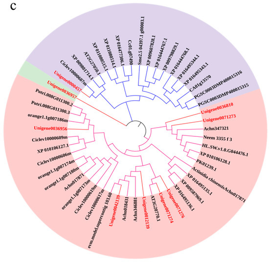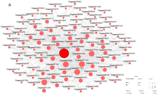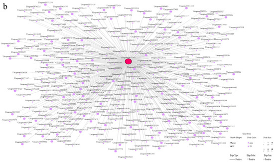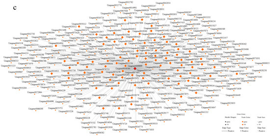 To better understand how DEGs in these TF families participate in protein regulation and mediation, we constructed a protein–protein interaction (PPI) network of the DEGs in the ABF, MYC, and EIN TF families. The results showed that the DEG related to the ABF family (Unigene0078257) interacted with 106 genes, forming a total of 472 interactions (Figure 9a). The DEGs related to the MYC family (Unigene0009899 and Unigene0027167) interacted with 349 and 348 genes, respectively (Figure 9b,c), to form 4531 and 3526 interactions, respectively, but there were no interactions with the DEGs related to the EIL family.