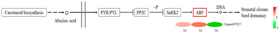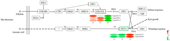 KEGG analysis showed that salt stress significantly increased the expression of the ABF TF family gene Unigene0078257 downstream of SnRK2 in the ABA signaling pathway, and Unigene0078257 expression more than doubled under N3 and N4 conditions (Figure 10). In the MAPK signaling pathway, the three EIN3/EIL TF family DEGs related to ethylene signal transduction were all up-regulated. Compared with levels after control treatment, expression levels increased more than 1.1 times after N3 and N4 treatments. In the Jasmonate signaling pathway, the two DEGs related to the MYC2 family were down-regulated, with expression levels less than 0.4 times those observed after control treatment (Figure 11).