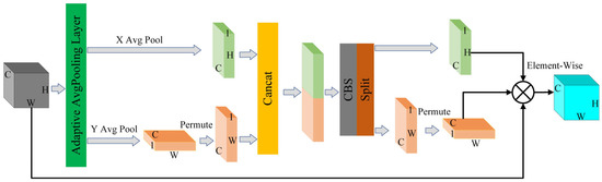Next, the Y-pooling feature map is permuted and aggregated with the X-pooling feature map to create a new feature map with a size of (H + W) × 1 × C. This aggregated feature is then processed using a CBS consisting of a convolution layer, batch normalization layers, and the SiLU activation function. The SiLU function applies the sigmoid function to the input value x and multiplies the result with the input itself, providing smoothness and non-linearity, and preserving certain linearity characteristics suitable for deep learning models.