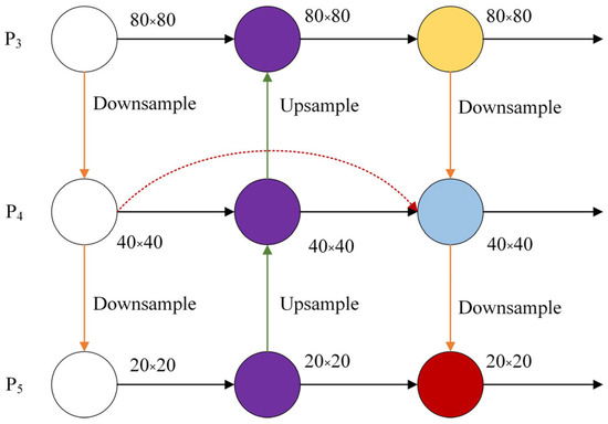 The bidirectional feature pyramid network (BiFPN) improves the FPN by incorporating a bidirectional feature fusion approach. It deletes the feature maps with single inputs, adds the extra connection between original and final feature maps, and down-samples the original feature map to make the network more accurate and efficient. In this study, the BiFPN is adapted and ported based on the PANet in the neck part to improve the detection efficiency and the muti-scale feature fusion. As shown in Figure 4, the relationship drawn by the red dotted arrow is the new improved connection. This new connection is utilized to aggregate more features in the middle scale layer for enhancing the small object detection ability without increasing the computational cost too much.