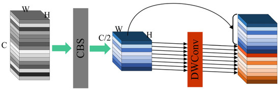 GhostConv can be viewed as a factorization of the CBS block into two parts, where one part has a large number of filters but fewer channels, and the other part has fewer filters but more channels. This factorization allows for a reduction in the number of parameters and computational cost, while maintaining a good balance between representation power and efficiency. As shown in Figure 5, the CBS block convolves the feature maps from C channels to C/2 channels by reducing the number of kernels. Then, the DWConv (depth-wise convolution) block is applied to each channel of the input feature maps independently, rather than being applied across all channels as in regular convolution, which is computationally efficient as it reduces the number of parameters. Unfortunately, the disadvantage of GhostConv is that it increases the number of layers of the model due to the depth-wise convolution. Therefore, GhostConv should only be used in the backbone in order to limit the growth in the number of layers.