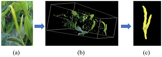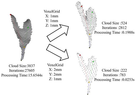 The processing time in Figure 19 includes the voxel filtering process. After voxel filtering with a voxel grid 1 mm × 1 mm × 1 mm in size, the cloud size was reduced to 1/6, the number of iterations was reduced to 1/10, and the processing time was reduced to 1/78, while the pose of the tea buds was correctly built. Furthermore, considering the sparse distribution of the pointcloud along the z axis due to the acquisition principle of the depth camera, we set the voxel grid with a size of 2 mm × 2 mm × 1 mm as the voxel filter, and the cloud size was reduced to 1/17, the number of iterations was reduced to 1/35, the processing time was reduced to 1/618, and the pose of the tea bud was correctly built. This test demonstrated that this method can be applied in real time.