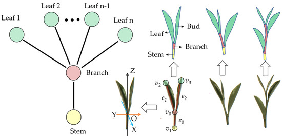 In this paper, we take one bud and one leaf (BL1) as an example, because the BL1 is a standard that appears most widely in famous and high-quality tea. The vertex v0 is the bifurcation of BL1, v1 is the stem, and v2 and v3 are the bud and leaf. e0, e1, e2 are the edges that connect v0 to other vertices. According to these elements of this graph, the space coordinates of this BL1 shown in Figure 7 can be established. The coordinate origin is the v0 vertex, the Z-axis that refers to the growth direction is the unit vector of v1v0, the X-axis is the normal vector of the plane v0v2v3, and the Y-axis can be obtained according to the right-handed rule.