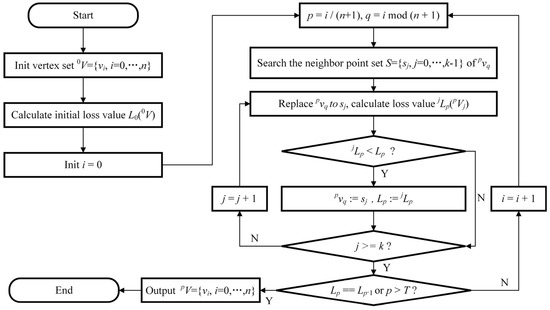 In each iteration, to start with, the nearest k points in the pointcloud of the query vertex pvq are searched and arranged from near to far to obtain the nearest neighbor points set S = {sj, j = 0, ..., k − 1}. Then, in the order of the index of set S, sj is used to replace the query vertex pvq to obtain a candidate set pVj. The loss value jLp of this candidate set pVj is calculated for comparison with the current Lp obtained from the last iteration. If the loss value is decreased, this query vertex is updated by this point, and the loss value is replaced by the new value. Otherwise, this point would be overlooked. After traversing set S, the query vertex pvq is replaced by each of the elements in set S in sequence, and the new vertex set pV with the smallest loss value Lp is obtained. If the loss value is changed and the number of iterations p is smaller than T, a new iteration is carried out.