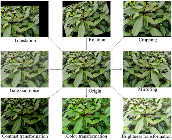 Therefore, some of the images in the dataset were pre-processed before training. This process may involve various techniques such as translation, rotation, cropping, noise addition, mirroring, contrast, color, and brightness transformation. All of these augmentation methods are shown in Figure 11.