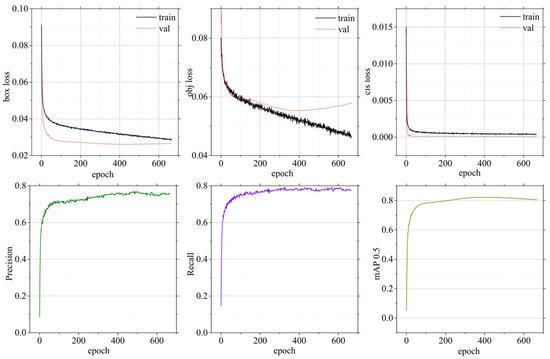 The improved YOLOv5 was developed using Python and based on the original YOLOv5l architecture. The model was trained and tested on Ubuntu 18.04 LTS using an Intel i7-10700 processor, an NVIDIA GeForce RTX 3090, CUDA Version 11.7, PyTorch version 1.8.0, and Python version 3.8. The training process consisted of 700 epochs with a batch size of 64 and an SGD optimizer. The training results are shown in Figure 13. The proposed model achieved its best performance in epoch 473, with a precision of 76.2%, a recall of 77.6%, and an mAP of 82%.