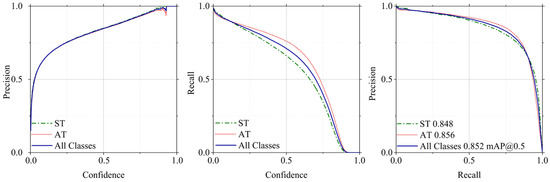 Furthermore, the model was tested on a previously unseen test dataset. The results for precision, recall, and mAP at different confidence levels are shown in Figure 14, with the best mAP of 85.2% achieved at a class ST of 84.8% and a class AT of 85.6%.