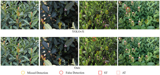After analyzing the errors in the test dataset, it was found that blurred objects in the image often confused the detector. This was especially true when the camera captured tea buds from a side angle, as the distant buds were also captured in the image. Due to the limited depth of field of the camera, these tea buds were often blurred, making it difficult to manually label all tea buds accurately. As a result, the model was more prone to errors when it encountered these blurred targets. Additionally, the occlusion between the tea buds and illumination (especially overexposure) also led to some mistakes in these detection results. All of these possible factors reduced the precision and recall of this detection model.
