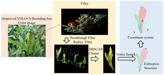 In this paper, the target was set as BL1 (one bud and one leaf). A total of 50 pointclouds including the BL1 target were acquired from the field using a depth camera. As shown in Figure 16, according to the method in Section 2.2.1, each pointcloud was detected using the improved model, filtered by a passthrough filter and a radius filter, clustered using the DBSCAN algorithm, and finally estimated via the OPVSM to build the coordinate system of tea buds.